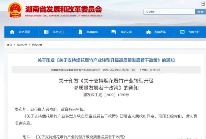 今天湖南省發(fā)改委官網(wǎng)公布關于印發(fā)《關于支持煙花爆竹產(chǎn)業(yè)轉(zhuǎn)型升級高質(zhì)量發(fā)展若干政策》的通知具體內(nèi)容如下: